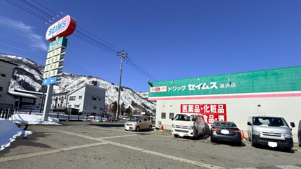 ここは国道17号線沿いで、越後湯沢駅からは徒歩で20分くらいの場所にあるドラッグストアです。