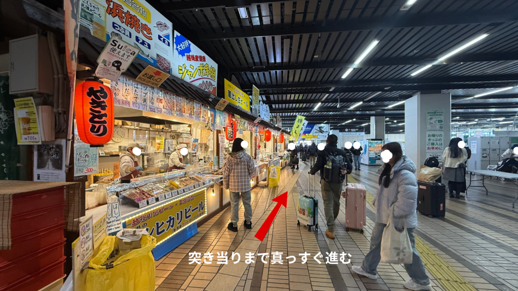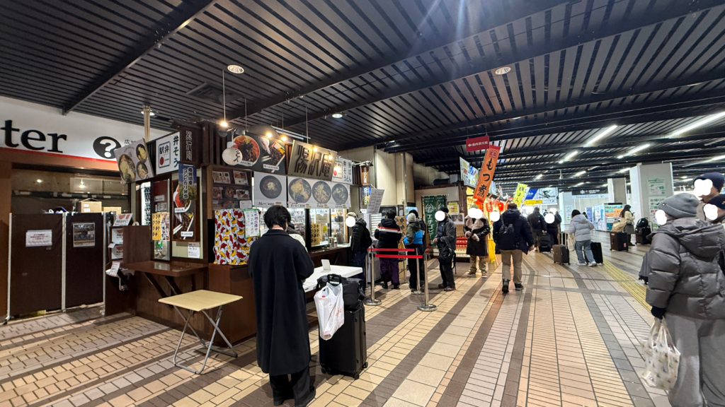 ①東口までは越後湯沢駅の改札を出て右手、立ち食い蕎麦のお店やこんな感じの屋台風のお店が並んでる前の通路を突き当りまで進みます。↓↓