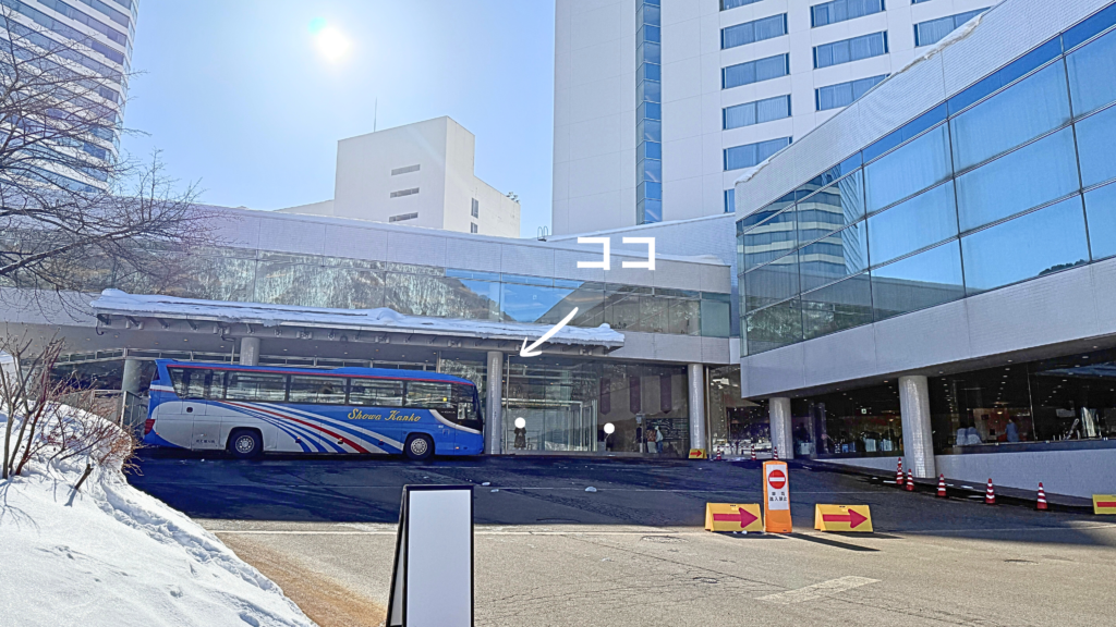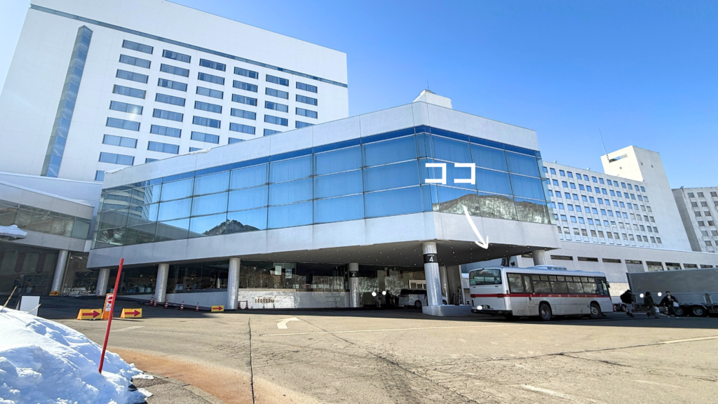 ここのバス降り場はゲレンデに向かって右手、ドーム型の屋根が特徴の日帰りセンターエヌ・プラトーの前です。 ↑↑