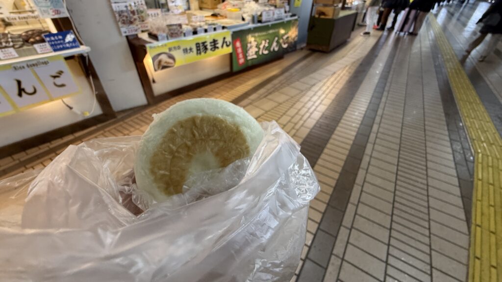 ここでは串焼き(こんにゃく・牛・海鮮・トウモロコシなど)、おやき、肉まん、たこ焼き、もつ煮、クレープ、大福などサクッと食べれるいろんな軽食が販売されています。