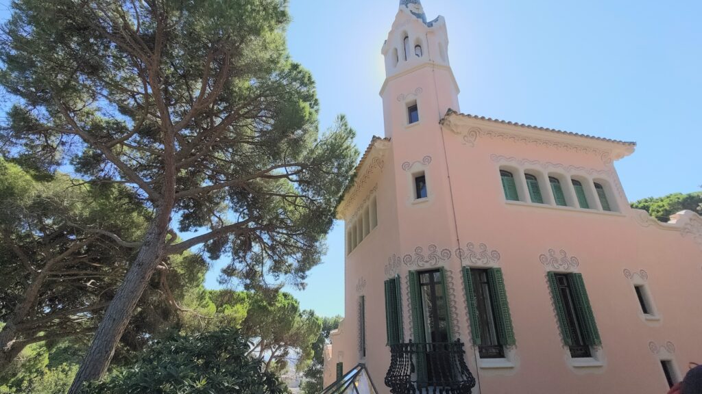 入口の公園を抜けると見えてくるピンクの建物がガウディハウス博物館です。