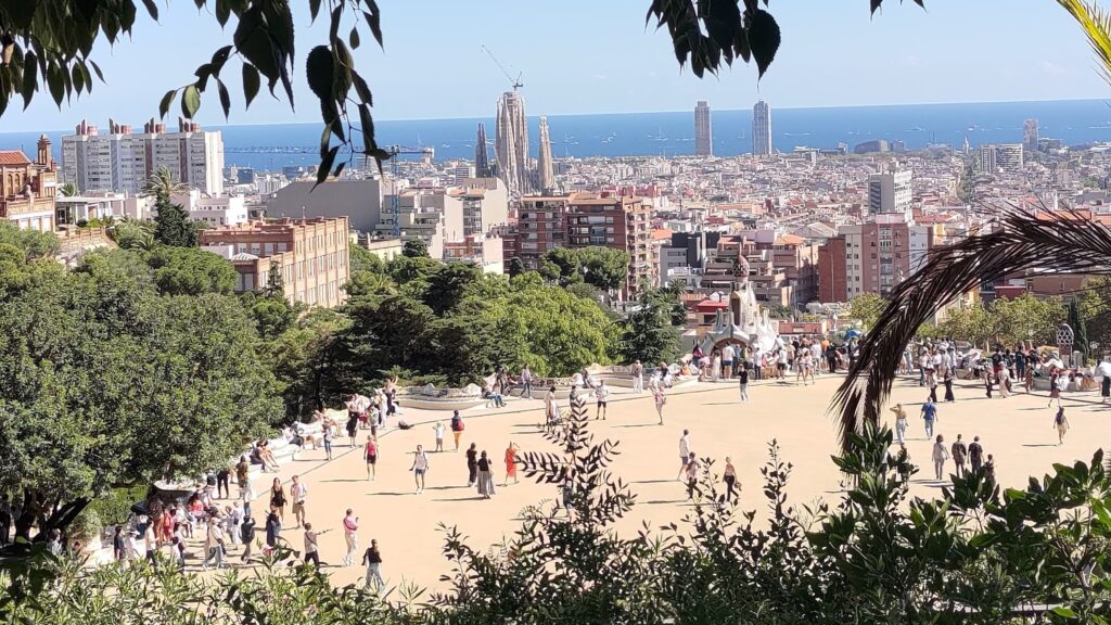 この広場の縁の部分(端の部分)の全部が波型ベンチになっていて、ここからはバルセロナ市内が一望でき、少し遠くにサグラダファミリアも見ることができます!
