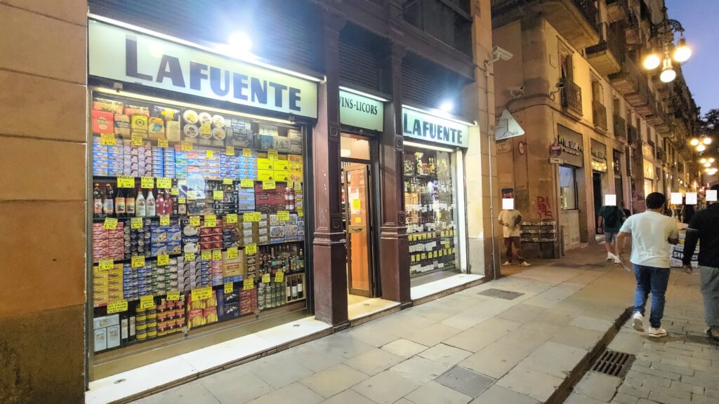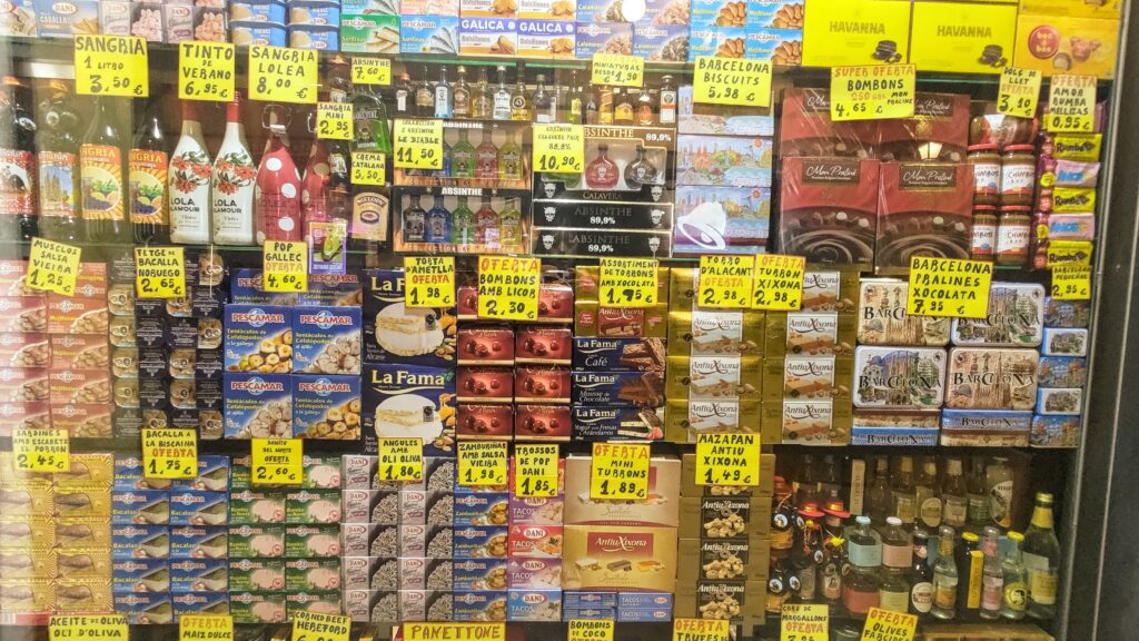 ↓↓ このお店、私個人的にはなかなか好きで、こんな感じでスペインのお菓子や缶詰、オリーブオイル、お土産に良さそうなバルセロナのロゴ入りの商品とかが結構売ってた!